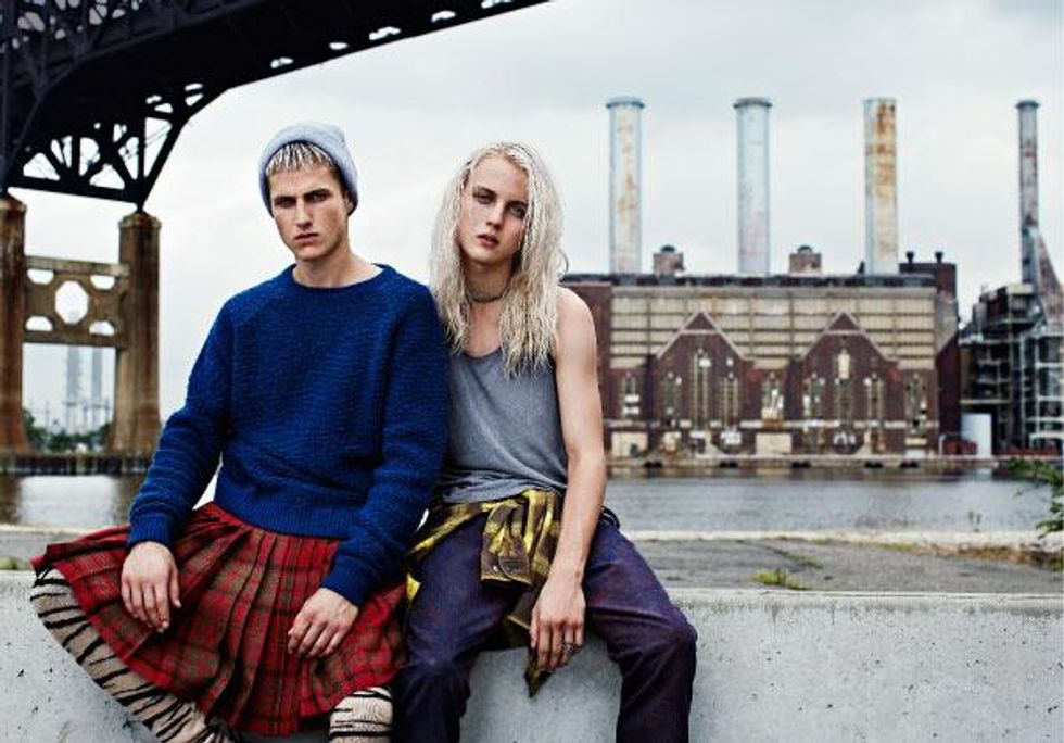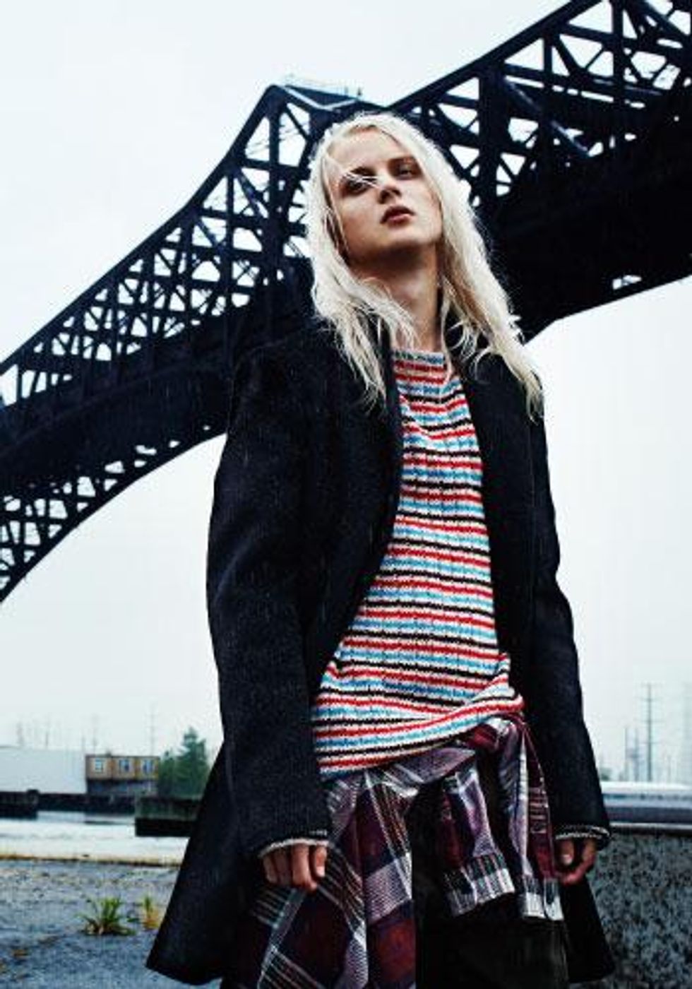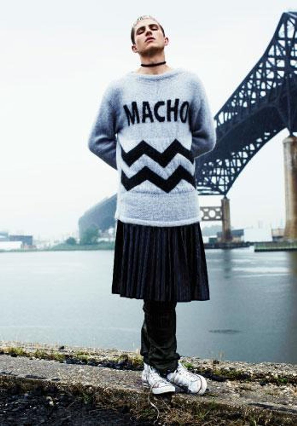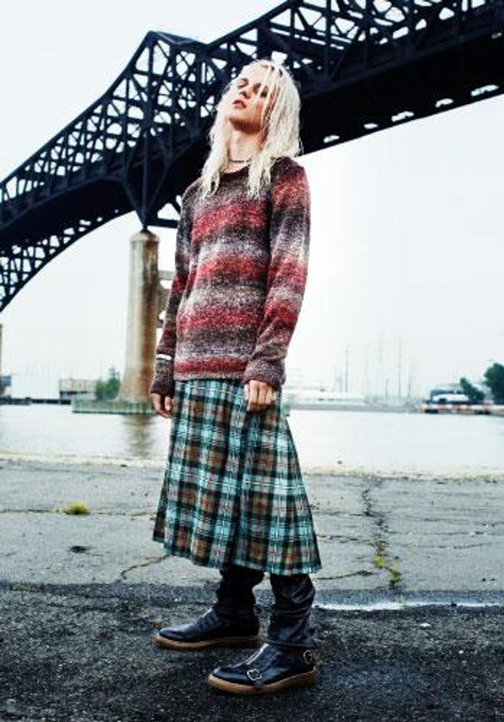 Sweater by Marc by Marc Jacobs. Kilt available for rent from Early Halloween. Leggings by Jeremy Scott. Hat by Topman. Tank top by T by Alexander Wang. Pants by Marc Jacobs. Necklace and ring by Saint Laurent. Flannel (worn around waist) by Marc Jacobs.