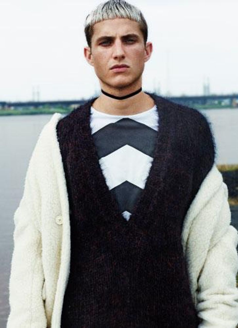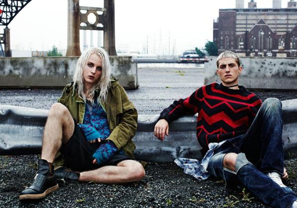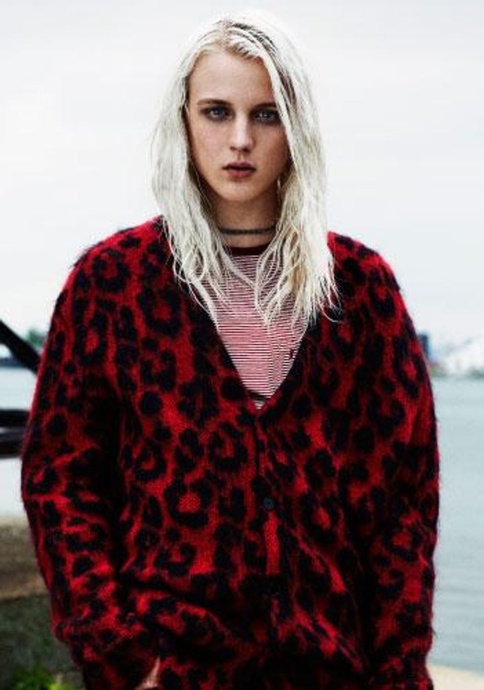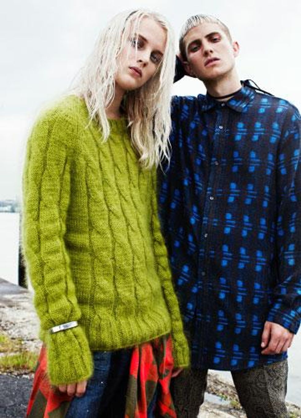 Sweater by Marc by Marc Jacobs. Kilt available for rent from Early Halloween. Leggings by Jeremy Scott. Hat by Topman. Tank top by T by Alexander Wang. Pants by Marc Jacobs. Necklace and ring by Saint Laurent. Flannel (worn around waist) by Marc Jacobs.