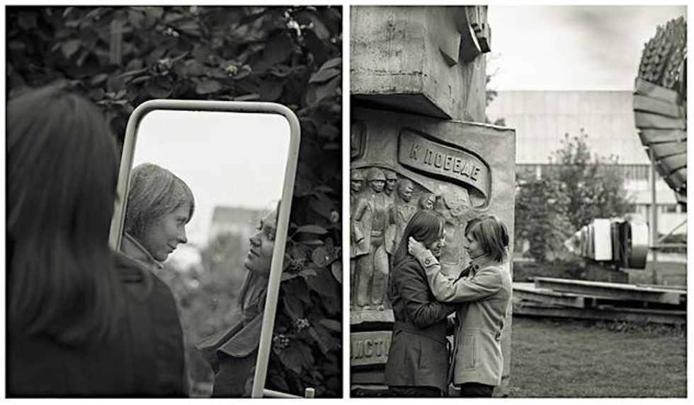 The first course stretches along the table: wild Siberian mushrooms, European blood sausages, salted sturgeon, salmon caviar, and homemade bread. Sergey has known Ilya since 1994 when Ilya opened Russsia's first official gay bar, and comes to this dacha every Sunday for dinner. He's an unassuming man in dark glasses who shares my passion for hypocrisy. The story du jour involves the recent Eurovision Song Contest. This year's compe- tition, broadcast from Sweden on Russian state TV, was officially sponsored by an LGBT organization, and the finale even featured an onstage lesbian kiss, but rather than refusing to air the show, an act that would certainly have caused civil unrest, the state-run network pretended not to notice.
