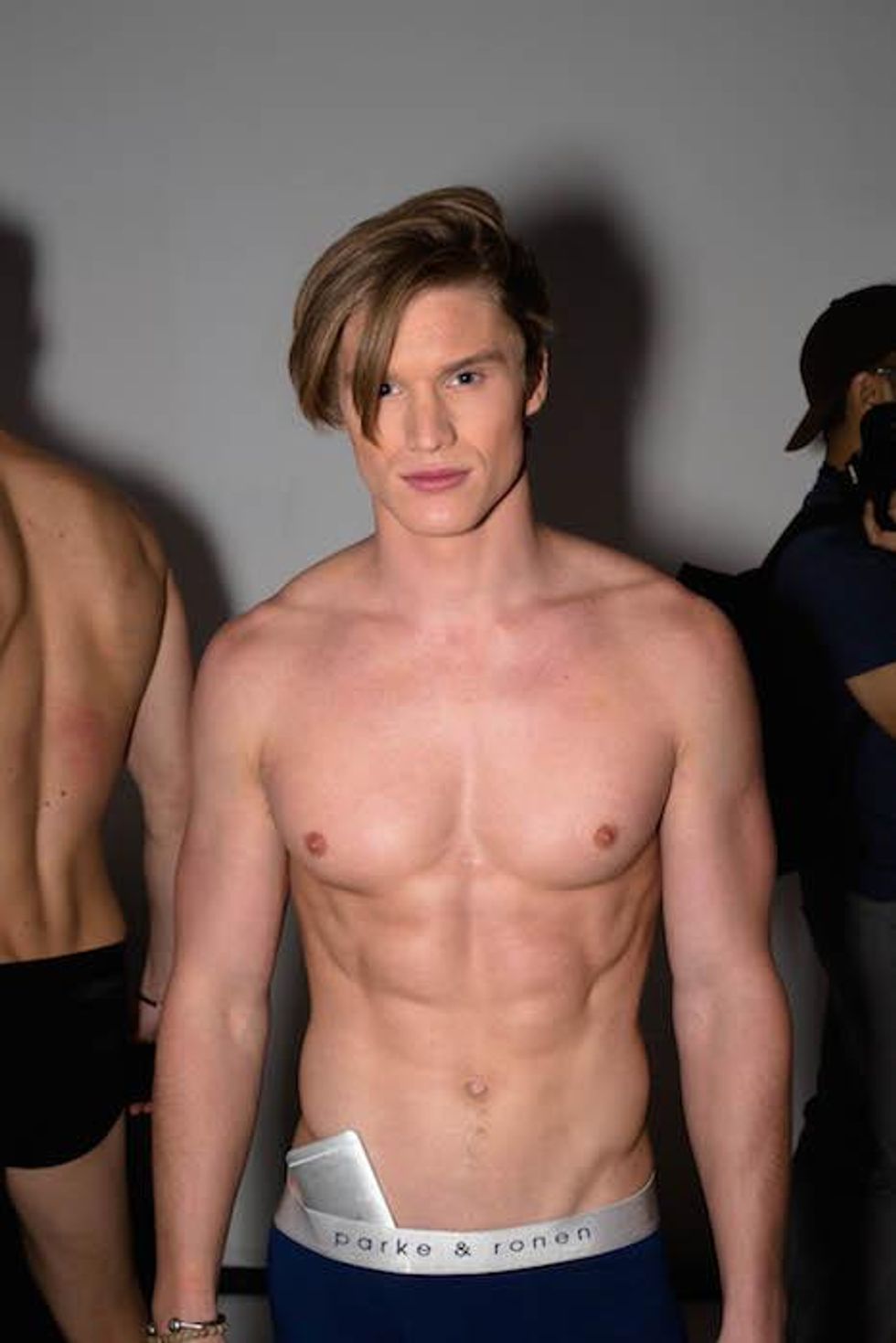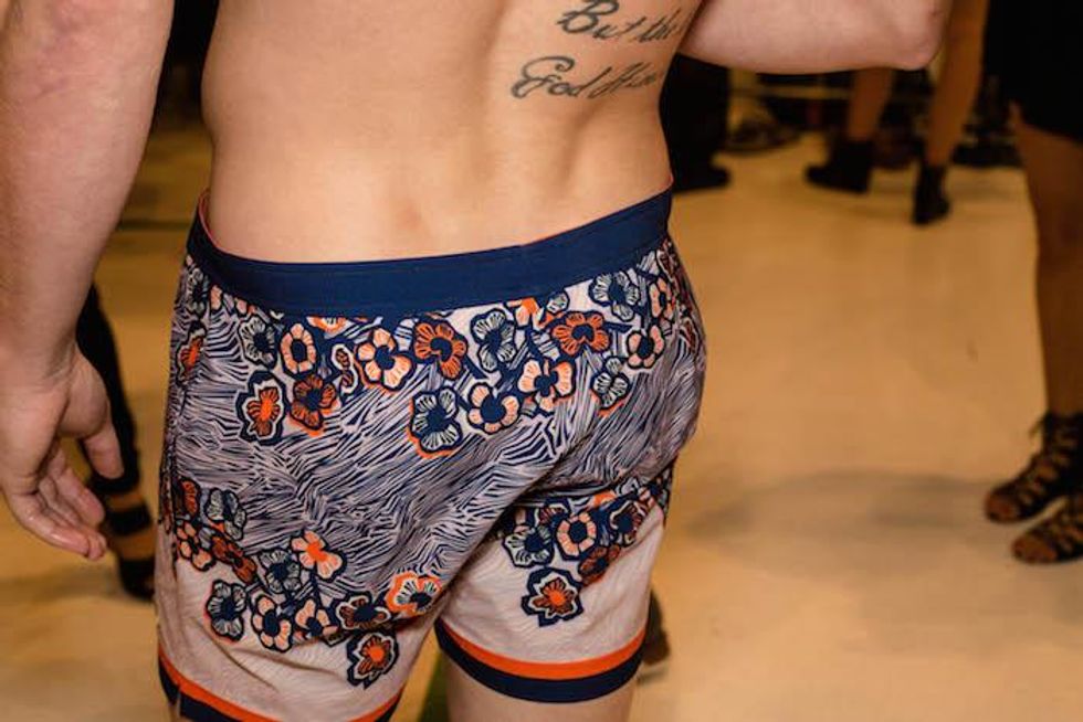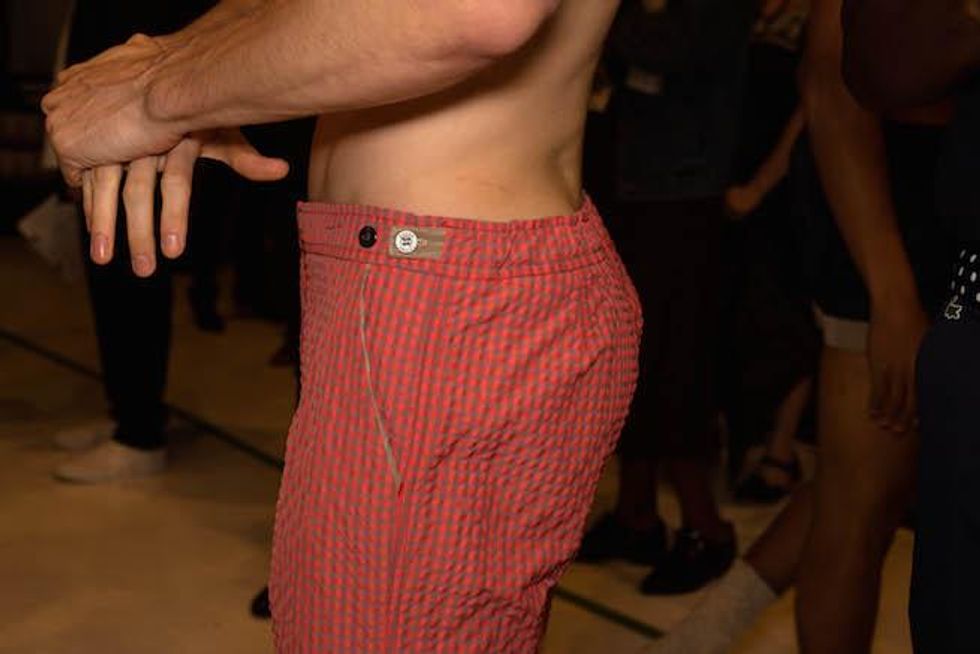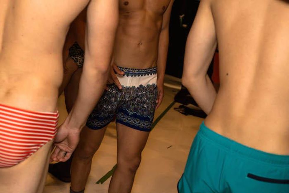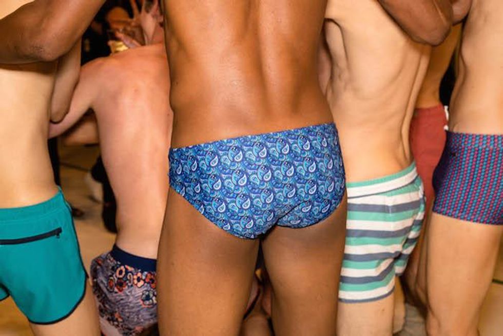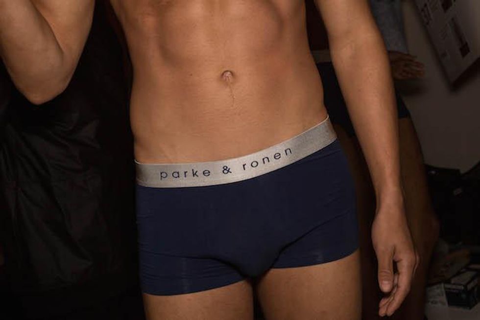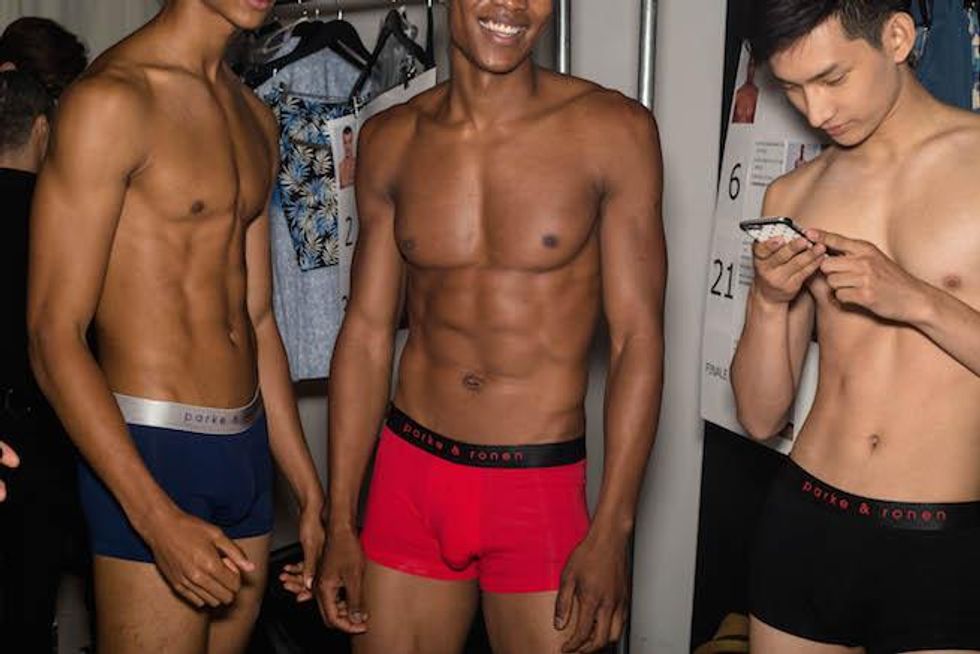 It was a celebration of the Seventies at Parke & Ronen. Inspired by Pan American Eastern airlines, designers Parke Lutter and Ronen Jehezkel took their cue from patterns found in flight lounges for their swimsuit and casual sportswear collection. We went behind the scenes to show you the boys in their undies (as well as some of the casual collection).