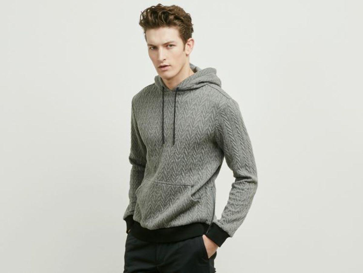 How do you turn a less-than-sophisticated menswear staple into a desirable designer piece? Easy: Just add some texture to it. Far from being just an athletic garment, your hoodie can also keep you dry and warm when you least expect it. Kenneth Cole's line of texturized pullover-style hoodies is all about the details: In addition to the drawstring hood and front kangaroo pocket, there's a side zipper to help you put it on faster, and a texturized herringbone effect on the fabric. Whether you get it in gray or black, this new dimension will surely add depth to your wardrobe.