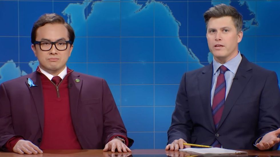Watch Bowen Yang and Colin Jost poke fun at Rep. George Santos on SNL.