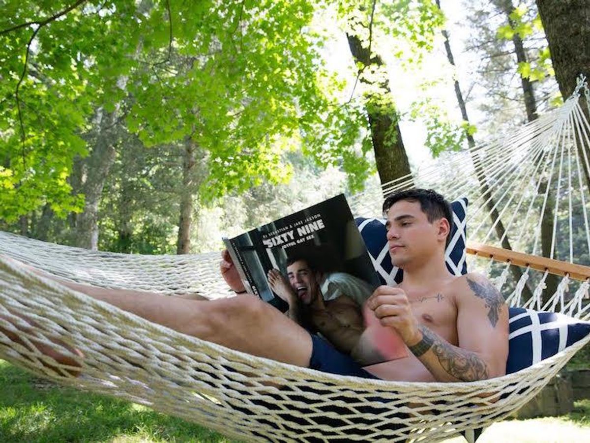 Now the studio is continuing to deviate from the industry's thrust-moan-cum curriculum vitae by breaking barriers on how many define porn with their new coffee table book, Sixty Nine: Joyful Gay Sex. The book includes 84 explicit images along with eight companion essays which serve as personal reflections on the relationship between Jaxson, Sebastian, and their third partner, Benny (who himself is the head of technology for the company). The photo book collaboration serves to give a peek into lives of the throuple as well as the inspiration behind their work.