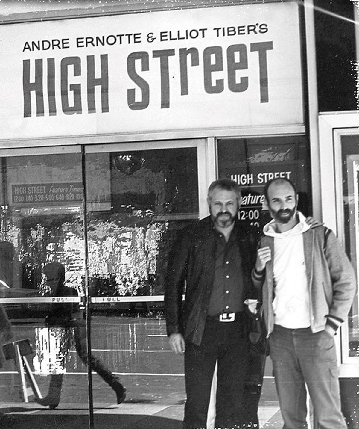 Photo: Courtesy of Elliot Tiber. Above: Elliot Tiber (left) and Andre Ernotte in front of a New York theater showing their film High Street in the 1980s.
