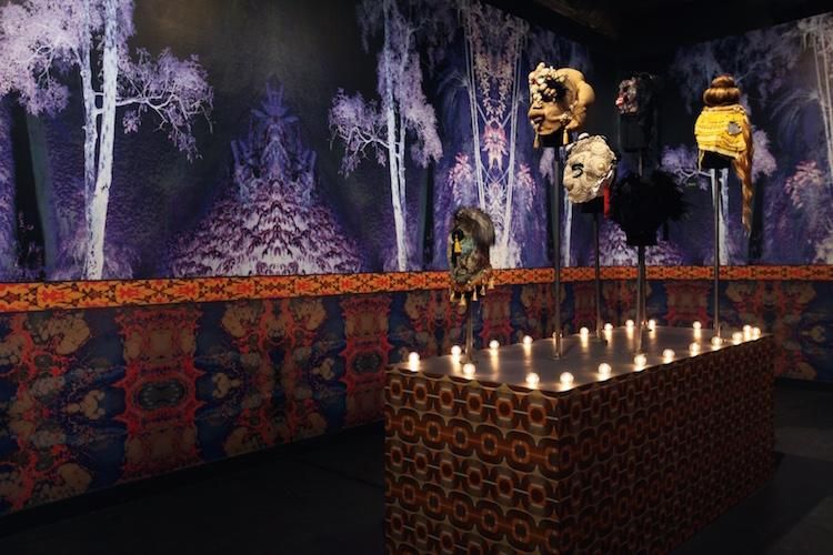 Between towering wallpapered walls and sensual portraits of himself and ex-lovers, six hand-sewn masks penetrate the center of the room on spikes like erotic voodoo heads. Stitched together with everything from Calais lace and tapestry shreds to pearls and human hair, they inject the room with a cryptic BDSM flair that's punctuated by the inclusion of two masked performers who lie coiled in the windowsill.