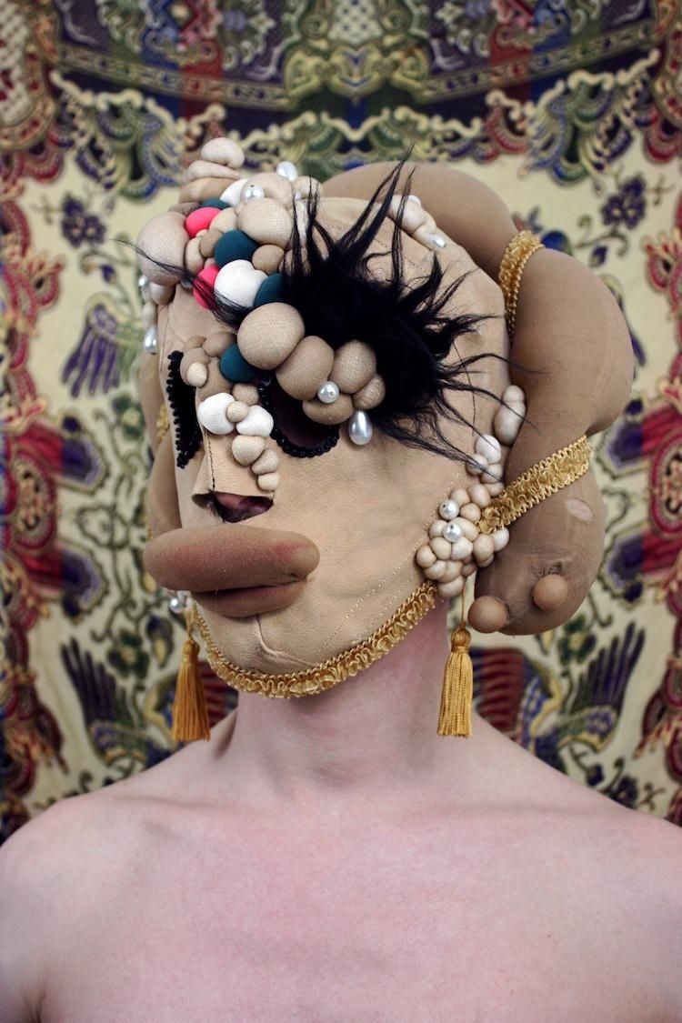 Each mask has its own identity. They are born out of curtains, carpets, sofas and other pieces of furniture one can find in the decrepit mansions of Champagne Ardennes where I grew up, or in Urbino, Italy, where I spent summers as a child. I always sew the masks myself and they have the shape of my head. In a way, these masks and my photographs will document the evolution of my body over time.