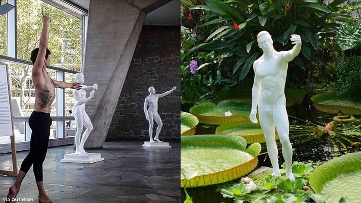The statues are part of an exhibit called "In Memory of Me," depicting nude male forms posed as though taking selfies. Several of the statues were positioned at UNESCO for European Heritage Days on September 21 and 22, when the agency celebrates cultural innovators throughout Europe. It was at this point that the underwear was added.