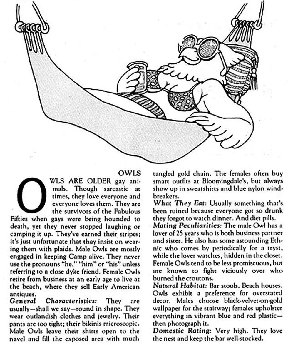 Arguably, the first usage was by George Mazzei in his article "Who's Who at the Zoo?" in the July 26, 1979, issue of The Advocate. Beautifully illustrated by talented longtime Advocate cartoonist Gerard Donelan, the article went on to blithely categorize other gay men and lesbians as types of animals in the zoo.