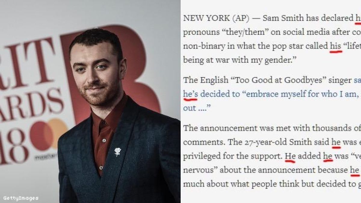 On Friday, in its coverage of Sam Smith's pronoun announcement, the Associated Press misgendered the singer. While its article stipulated that Smith would be using they/them pronouns, in the story the news agency repeatedly used he/him throughout. The article drew backlash on Twitter.