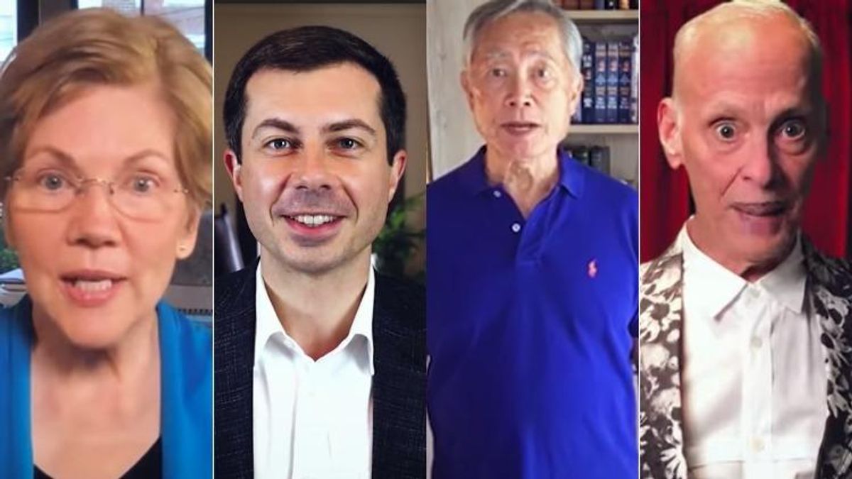 Of the celebrities and politicians that appear in the clip are Pete Buttigieg, John Waters, George Takei, King Princess, Karen O, Phoebe Bridgers, Eric Andre, Elizabeth Warren, Michael Pena, Sarah Silverman, Susan Sarandon, Jamie Lee Curtis, and more. While we aren't getting full-on vocals from them -- which is probably a favor to us -- they all do their part in the little cover that could. Sprinkled throughout are cues to "VOTE"