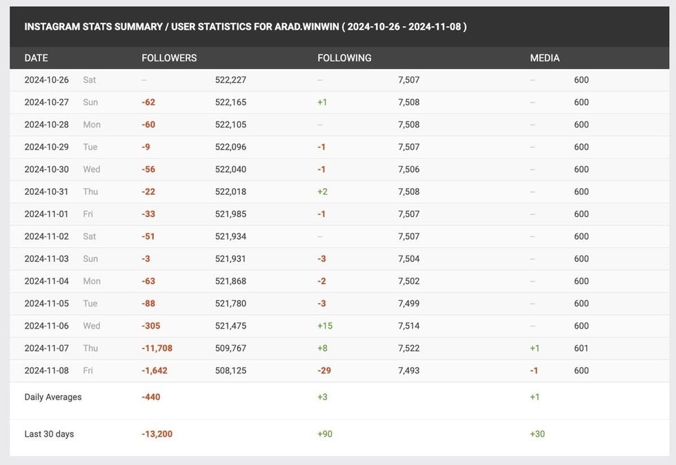 According to data from Social Blade, Arad Winwin has lost 14,100 followers on Instagram between October 26 and November 8. On Thursday, November 7 alone, 11,708 users unfollowed Winwin on Instagram.