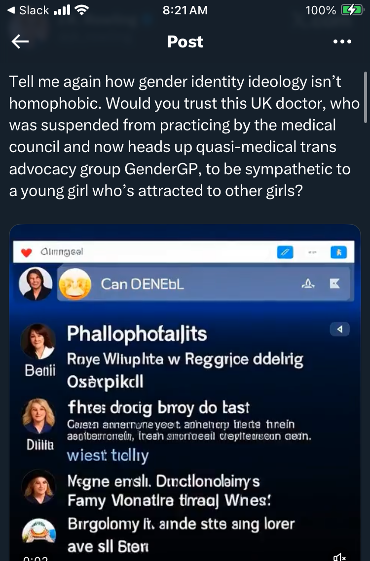She included a six-second video that shows a tweet from Dr. Helen Webberley saying, "Have you noticed that the only argument they have is that if you have a willy, you must be a man. I wonder whether an absolute fear of willies is what drives them? Phallophobes need help, bless them, cos some people find willies wealy wealy scarwy."