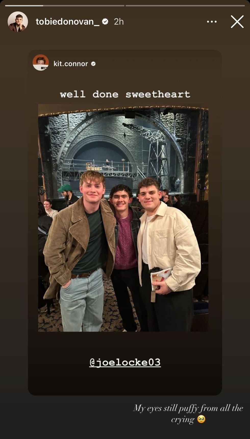 “Well done sweetheart,” Connor wrote on Instagram stories after the show, sharing a pic of the three of them in the theater.