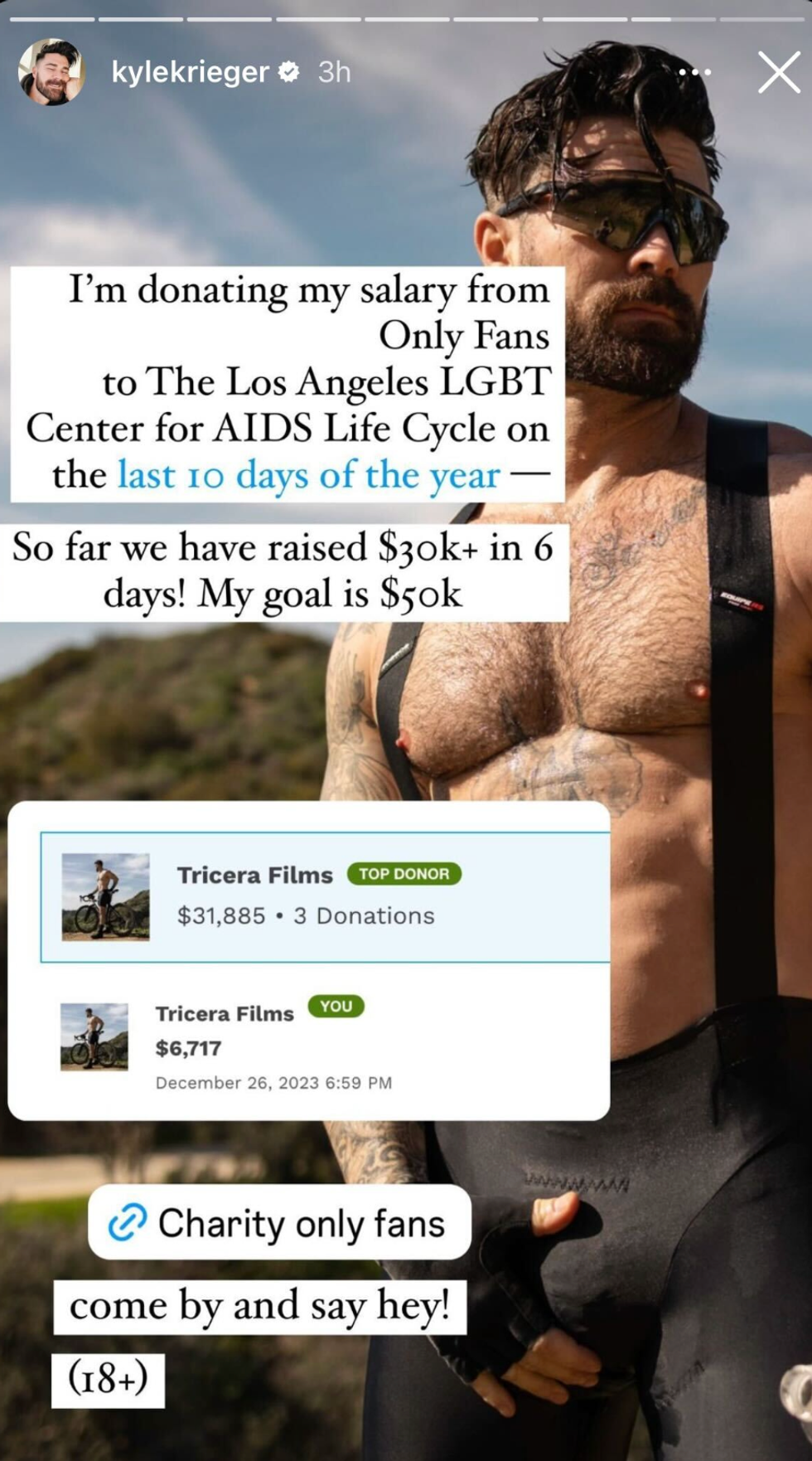 On Dec. 20, Krieger let his fans and followers know he’s raising money for the 2024 AIDS Life Cycle, and that every dollar spent on his OnlyFans from Dec. 20 through Jan. 1 would be donated. His overall goal is to raise $50,000 in 11 days.