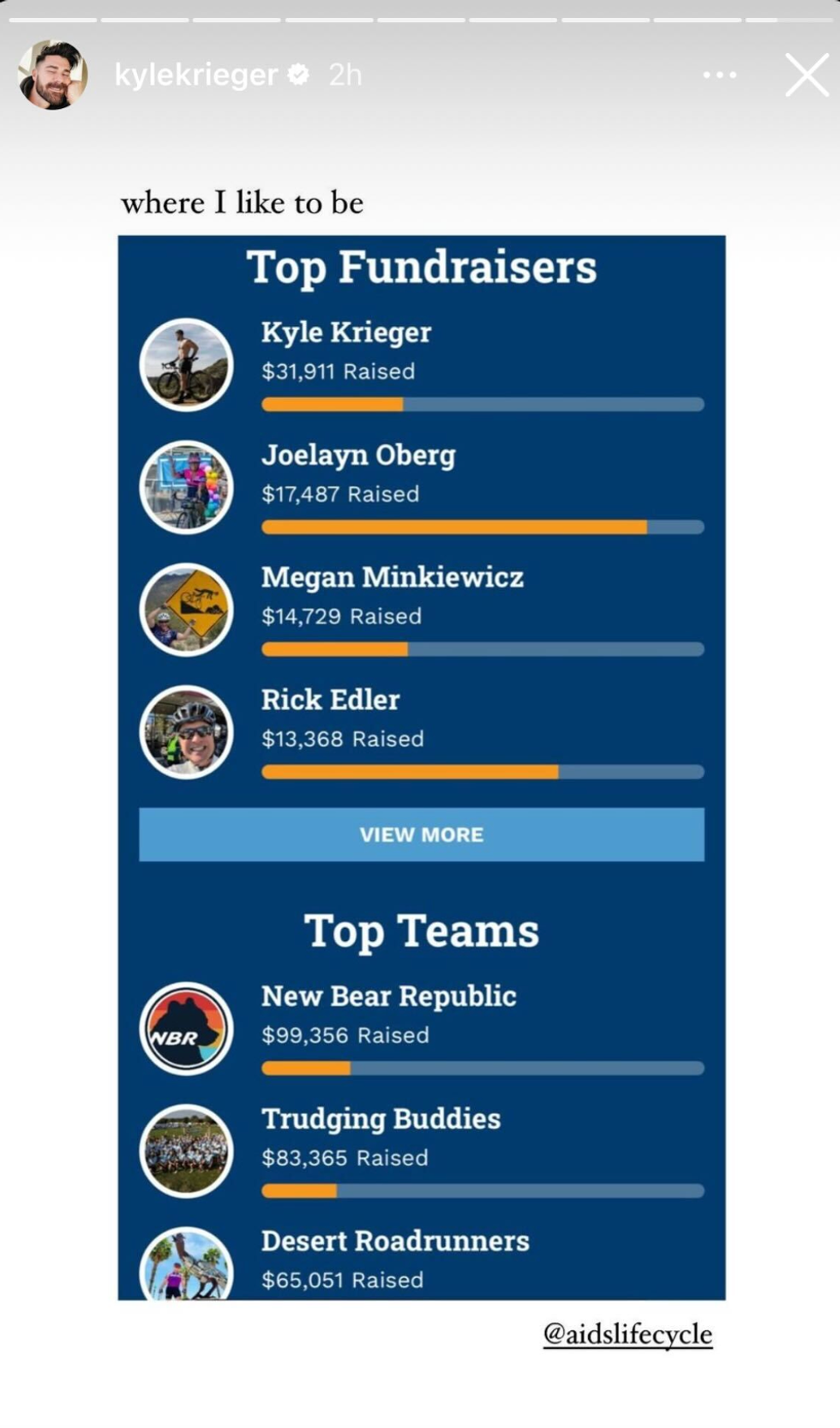 In a subsequent Instagram story, Krieger shared a screenshot of him as the top fundraiser for the AIDS Life Cycle. He is already close to reaching $32,000 in donations, doubling the $17,500 for the donor in second place. “Where I like to be,” Krieger wrote, referencing that he is in the top spot.
