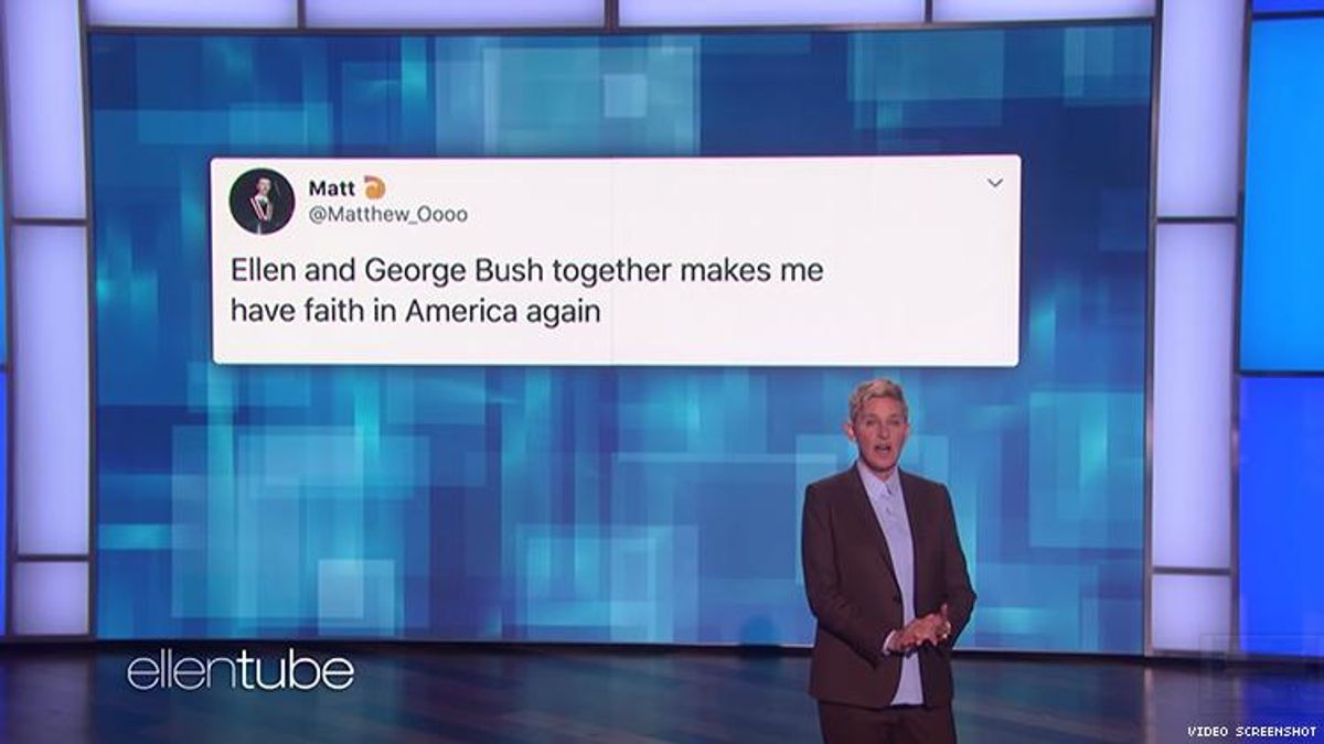 Rather than admitting that, hey, maybe it's bad to kick it with someone whose administration tortured lots and lots of people -- and then repeatedly sought to justify it -- DeGeneres showed her audience a screenshot of a tweet that read: "Ellen and George Bush together makes me have faith in America again."