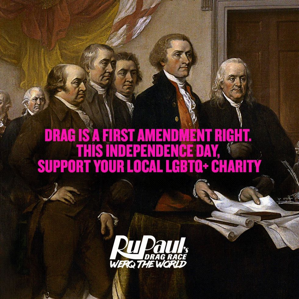 Produced by Uncommon Creative Studio and RuPaul's Werk the World tour, the billboard depicts the 1776 signing of the Declaration of Independence and reads: "The declaration of independence was written by men in wigs, heels & tights. Drag is a first amendment right. This Independence Day, support your local LGBTQ+ charity." (There's Trans Law Center or The Point Foundation or National Black Justice Coalition and many, many others.)