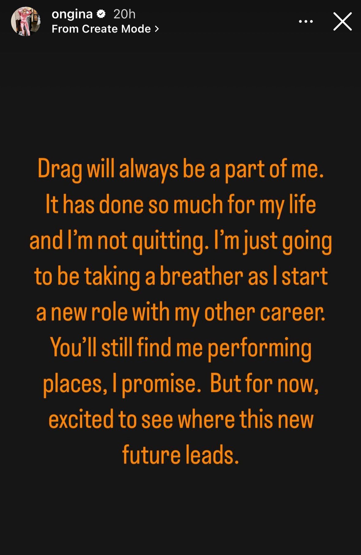 And in a post to her Instagram story, Ongina wrote: "Drag will always be a part of me. It has done so much for my life and I'm not quitting. I'm just going to be taking a breather as I start a new role with my other career. You'll still find me performing places, I promise. But for now, excited to see where this new future leads."