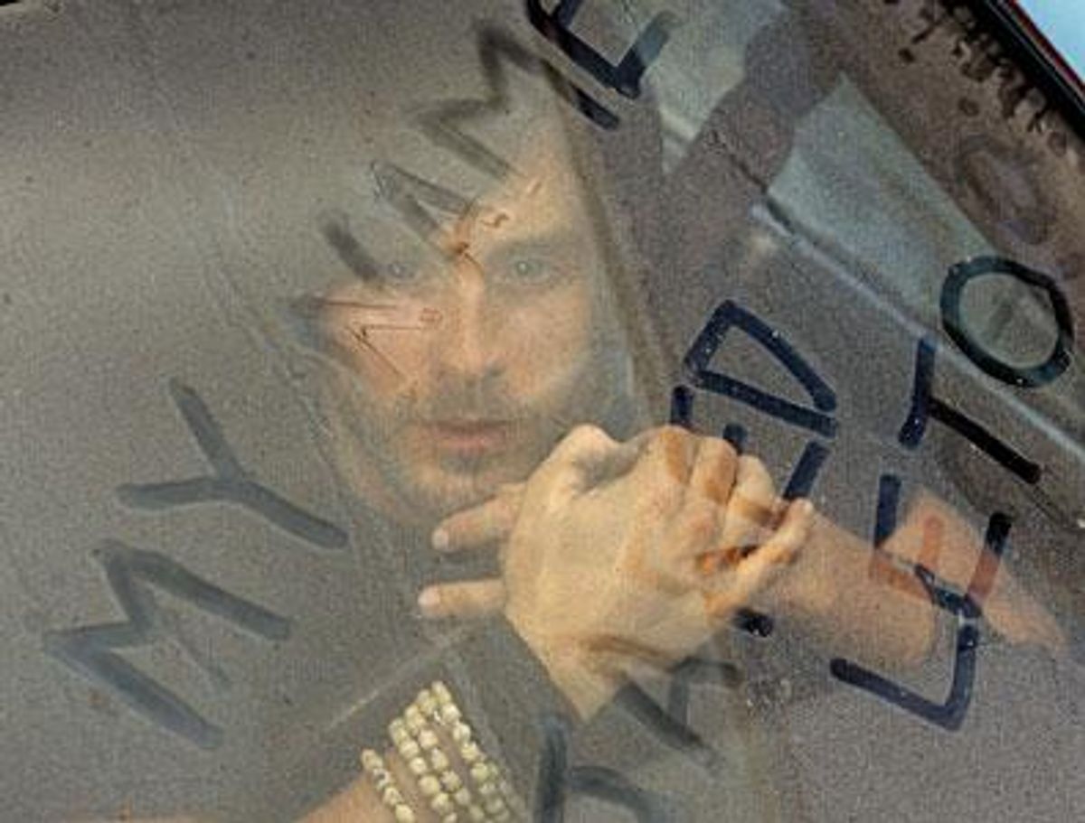 Leto'who in the past has been noted for sporting blue nail polish'is wearing a tight 'wife beater' and a pair of low-slung black pants. The gap between the two well-worn garments shows off an inch or two of flesh at his midriff, and from behind, when he is standing, a little bit of backside is visible too. Trim as a clothespin, he seems to care as much about covering up his tight V-shaped body as he worries about watching what he says. Unlike many stars, this is an actor who's isn't preoccupied every second with guarding his image.