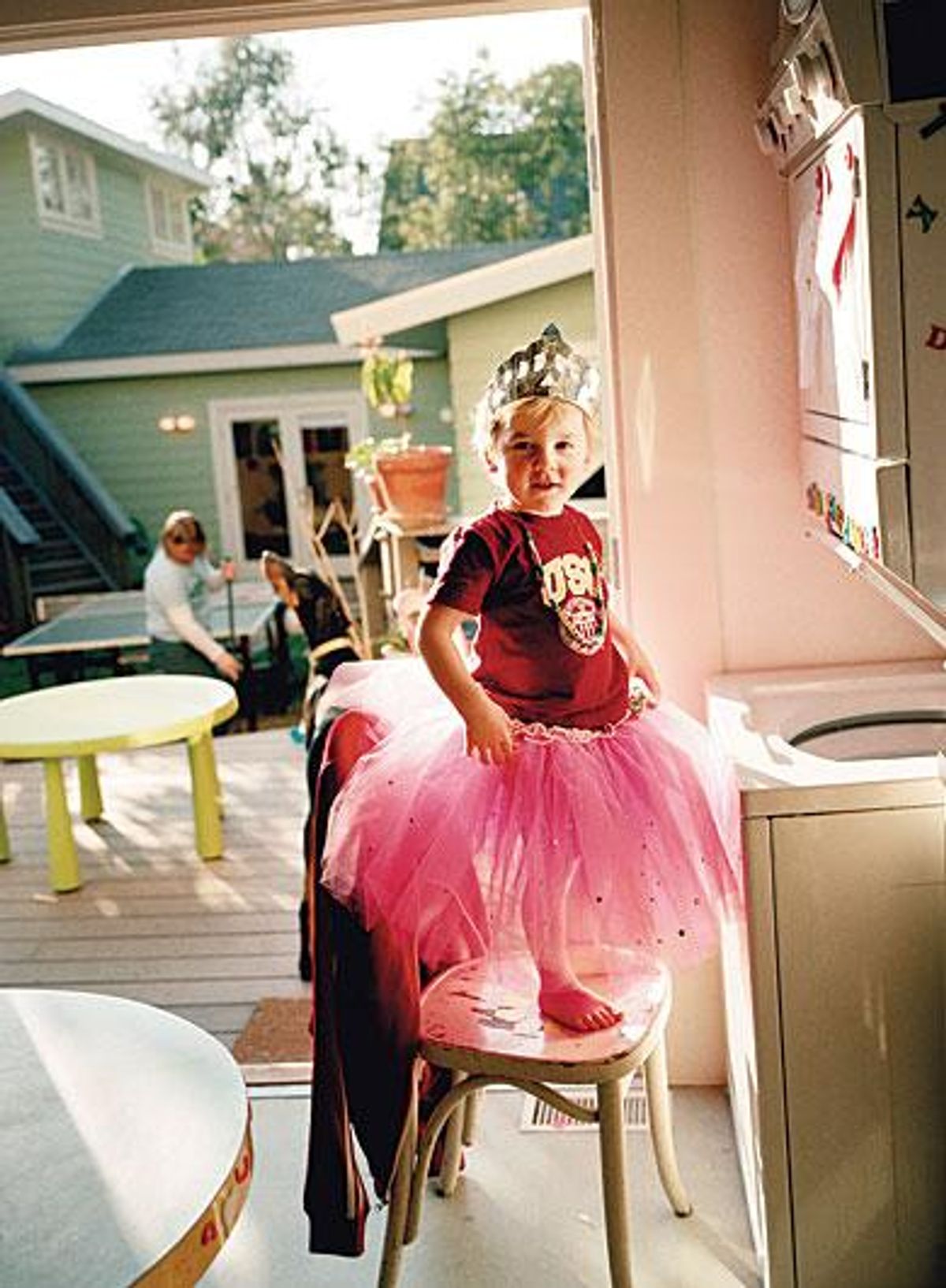 Opies son Oliver can be seen employing this philosophy. In her photograph Oliver in a Tutu the cherub-faced child smiles in a college sports shirt and a bright pink tutu -- an eradication (or embracing) of differences in gender roles. Life still goes on in the background: The sun is at afternoons level, the laundry is coming out to be folded, and eaves that are to be painted chocolate-brown years later frame the day.