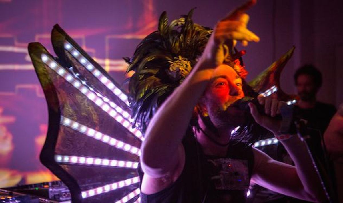 The set went smoothly, Adversary sampling his own voice into hypnotic house melodies and a drummer playing virtual drums, hitting special panels in time with the beat. As a highlight, a saxophone started to jazz up the room, igniting the crowd into a frenzy. When the music stopped and Adversary bowed, I found a chance to speak with him.