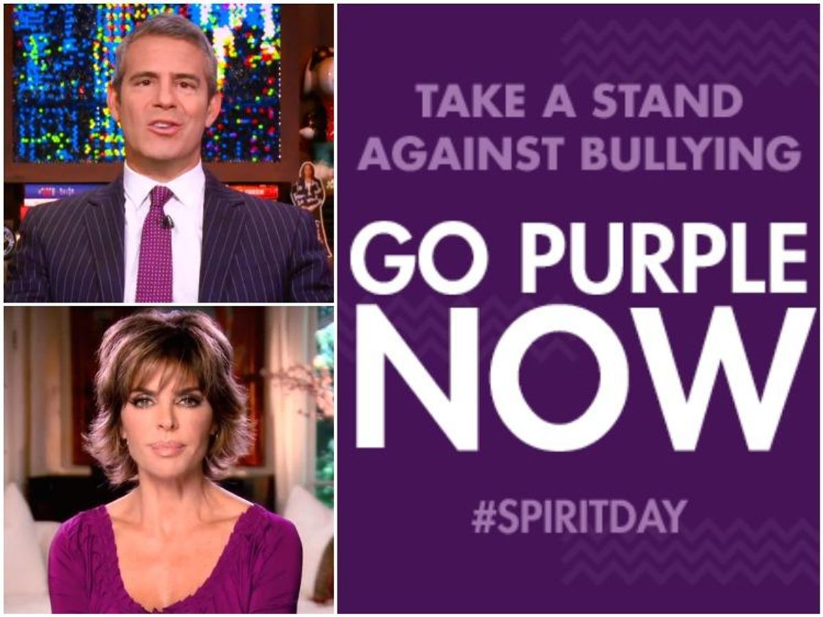 Bravo has shared a video of the network's most recognizable celebrities -- including Andy Cohen, Kyle Richards, and Lisa Rinna -- to urge everyone to wear purple tomorrow, October 15, in support of LGBT Spirit Day.