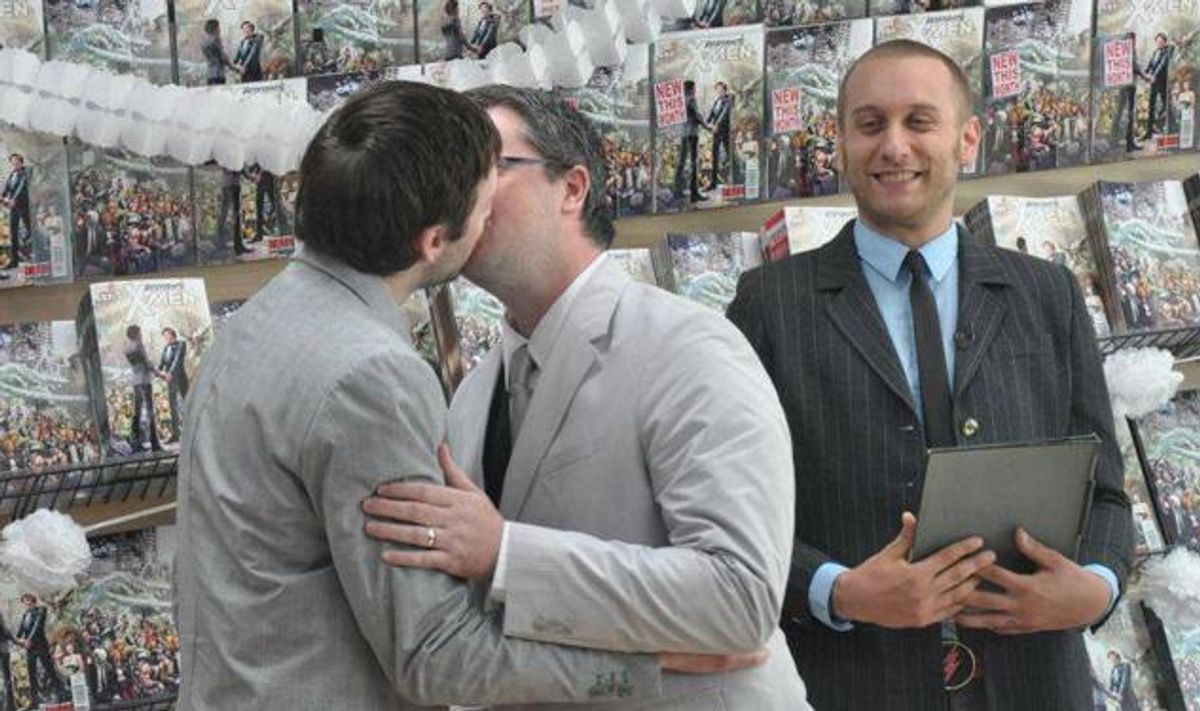 But Beaubier and Jinadu weren't the only ones to say "I do". In conjunction with the landmark event, Jason Welker and Scott Everhart married among the comic book racks at Midtown Comics in a private ceremony yesterday morning. The couple, from Columbus, Ohio was chosen from more than 50 applicants to celebrate their union in the popular New York comic shop, followed by a reception at Humphrey's in the Eventi Hotel.