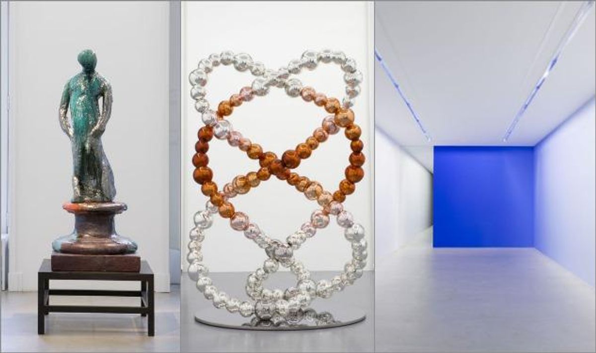 Elsewhere in the gallery, Pieter Vermeersch series of untitled paintings capture the "negative" light from photos of the sky, turning the optimistic blue into a haunting orange and giving viewers a look at the unseen side of a familiar sight. And John-Michel Othoniel's mirrored sculptures raise what the artist calls "the question of the lost body."