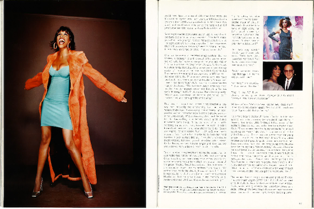 In May 2000, Out magazine published this cover story on Whitney Houston with cover and interior photography by David LaChapelle. In the story, writer Barry Walters asks Houston about the lesbian rumors that had persisted throughout her career and includes the quote: "I suppose it comes from knowing people...who are. I don't care who you sleep with. If I'm your friend, I'm your friend. I have friends who are in the community. And I'm sure that in my days of bein' out, hanging with my friends, having nothing but females around me, something's gotta be wrong with that."