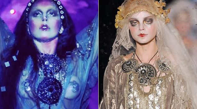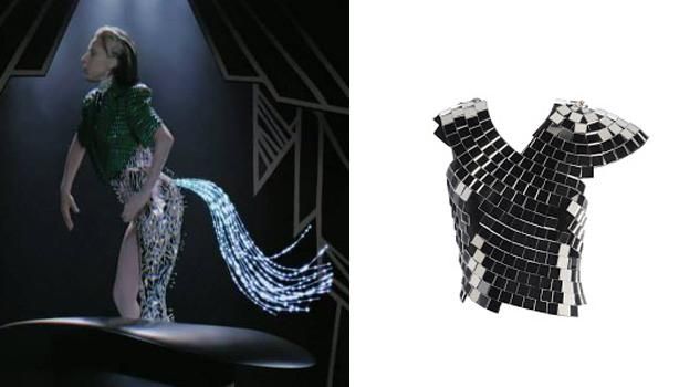 Then we see the singer emerge in an outfit that pays homage to both Galliano's Fall/Winter 2009 collection and Metropolis.