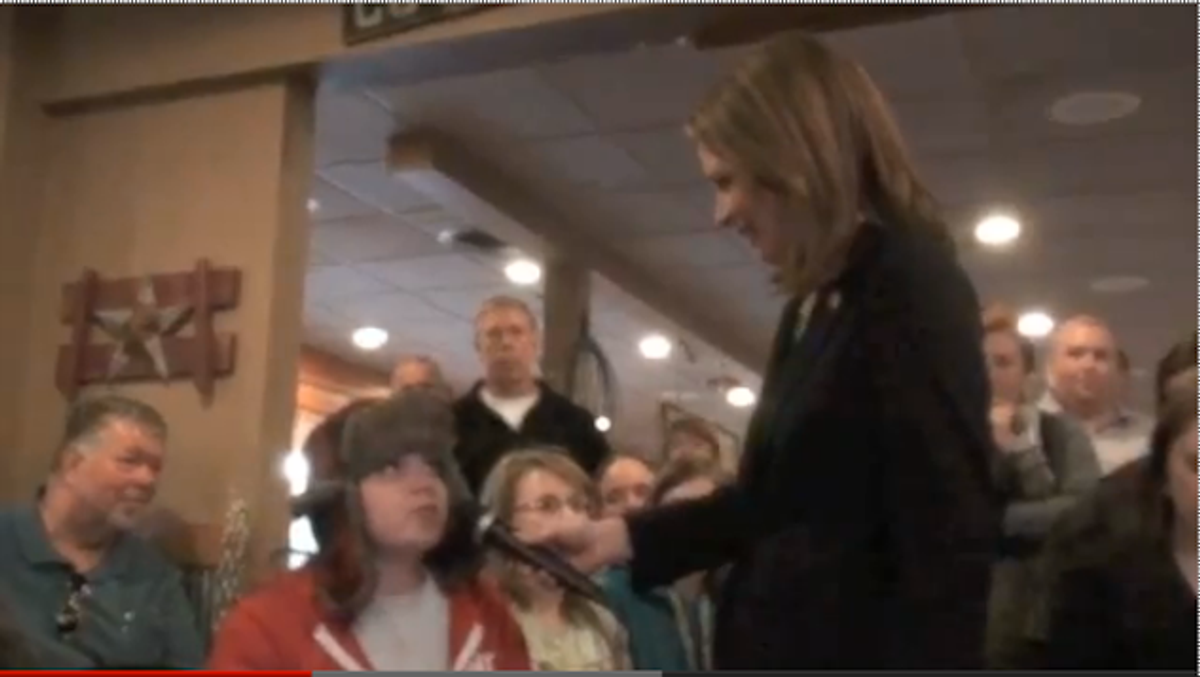 Not a day goes by without news of Michele Bachmann--in her near-dead presidential campaign--testing the limits of illogical rhetoric on gay rights. But when she's exposed and challenged by someone more than half her age, like she was at last night's Town Hall Meeting at the oddly named Waverly Pizza Ranch in Iowa, it's particularly enjoyable, if predictably infuriating.