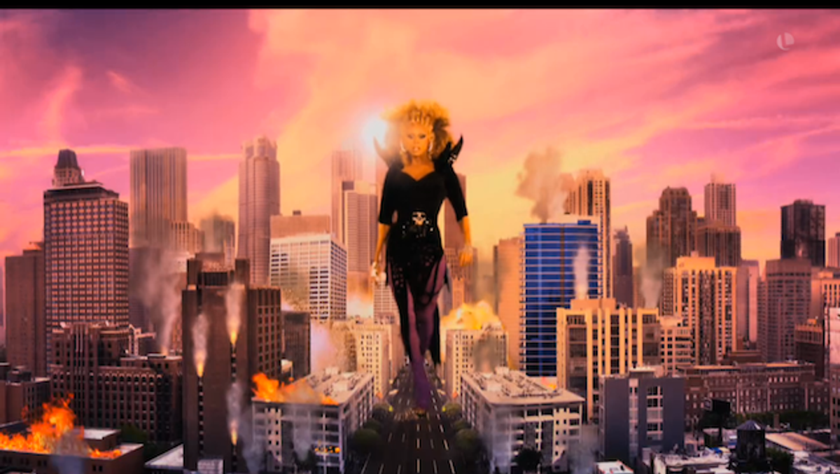 You'll spot Michelle Visage, Wynonna Judd, Pamela Anderson, and more romping about while Ru belts one of our favorite of her songs and some design interns go to town with the crazy Godzilla-attacks graphics and over-the-top camp.
