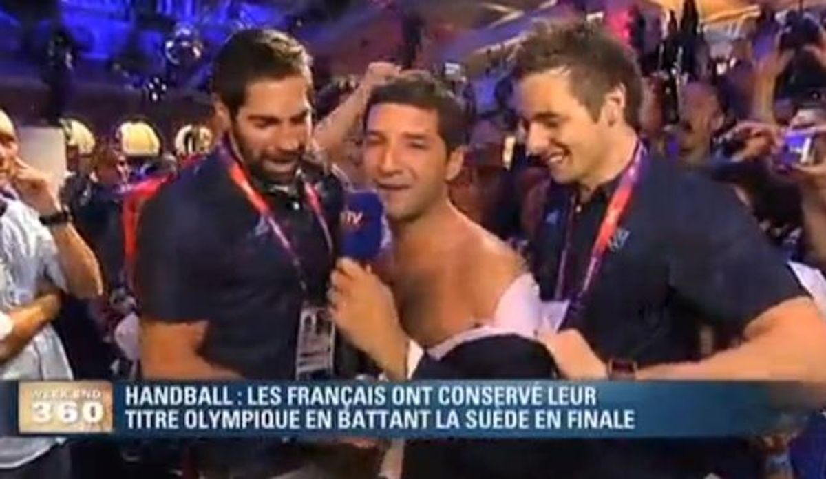 To celebrate, star players Nikola Karabatic (the one with the beard) and Xavier Barachet not only destroyed a table in the post-games clubhouse, but they also attempted to removed the shirt of the very earnest (and cute) Nicolas Jamain, a journalist for L'Equipe on BFM TV as he tries to get in the tiniest bit of interview.