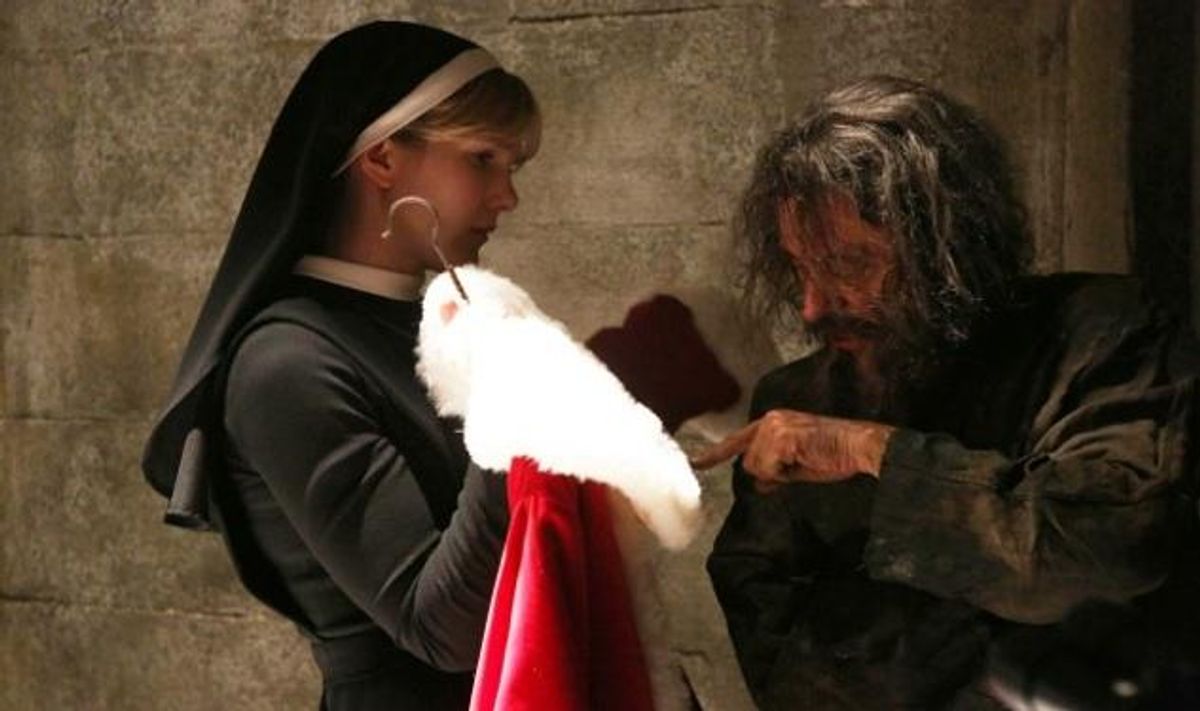She has the perfect scapegoat--two, actually. Sister Jessica Lange had earlier arrived at Briarcliff to hold the razor blade that Sister Lily Rabe meant for her suicide against the possessed nun's throat. Add that to the mass-murdering Santa we met in a prologue--he killed 18 people one Christmas night--who Sister Lily Rabe frees from solitary, and case closed! Just to be sure, she locks Sister Jessica Lange in the office with Santa (played by Ian McShane, who, by the way, was quite the hottie back in the day), where he punches and canes her until the inevitable attempted rape. Before he can deliver a "big ticket item from Santa's sack" she jams a letter opener into his neck.