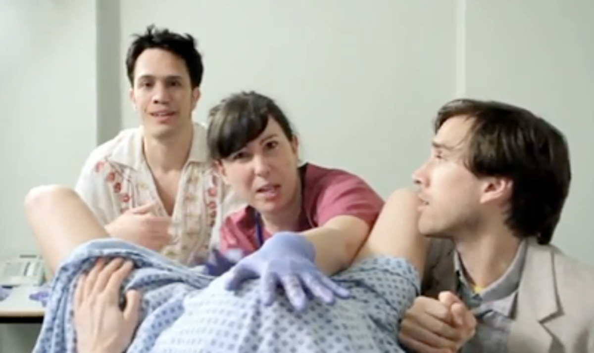 We introduced you to the 10-part webseries comedy--about a gay male couple and their friend who has agreed to be their surrogate--when The Vessel premiered back in October. Told from the perspective of the pregnant belly, in the finale we see, well, the expected conclusion when the baby is delivered. In a long line of hilarious birthing scenes, this one has its own unusual comic timing and wonderful looks by midwife (played by Daphne Kouma). T