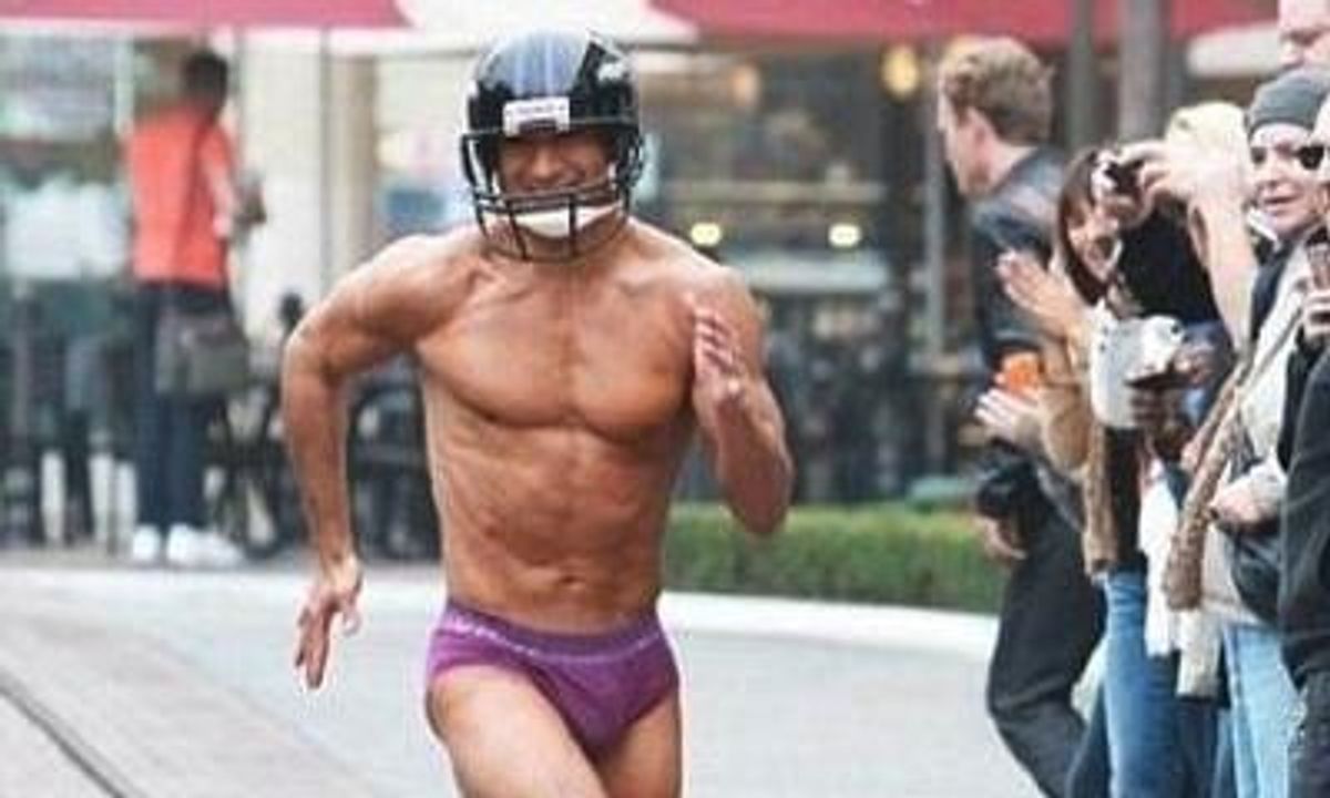 Unfortunately for him--but great for us--the Ravens won the game, so he stripped down and jogged down the street in his undies and a helmet. And in the process made us all feel like the winners.
