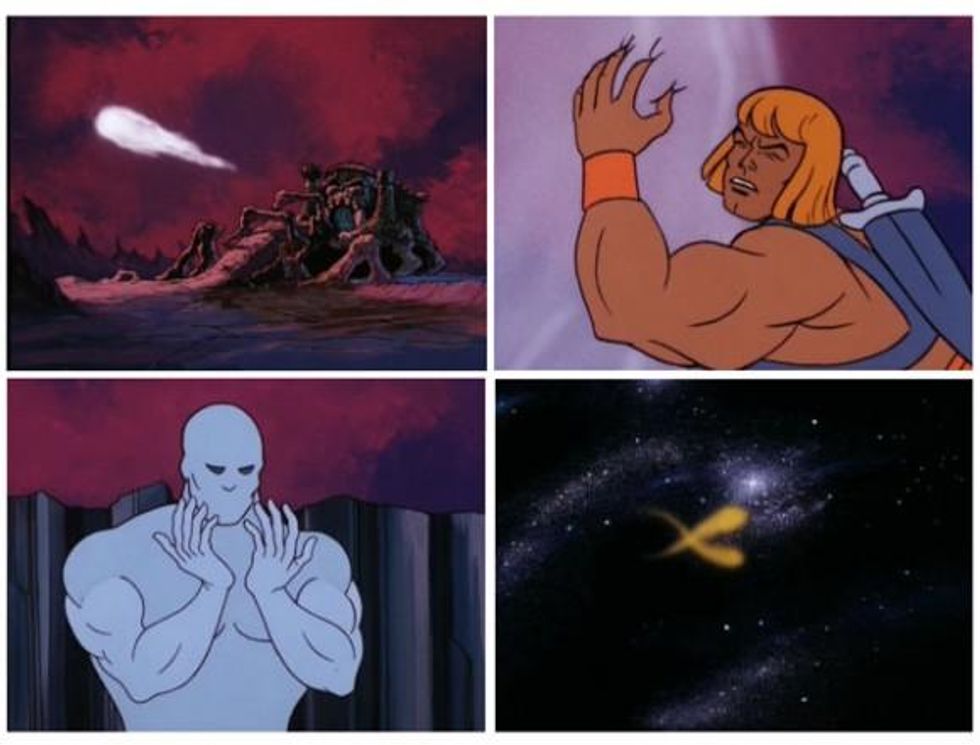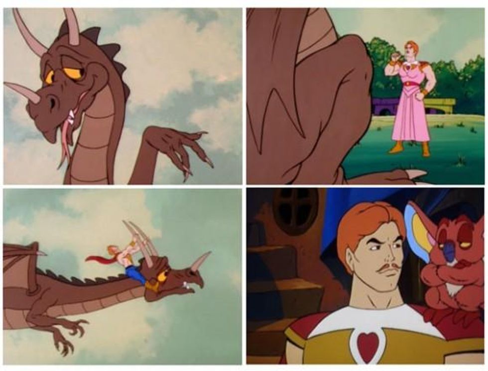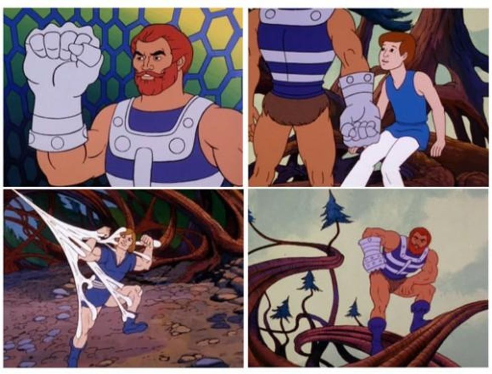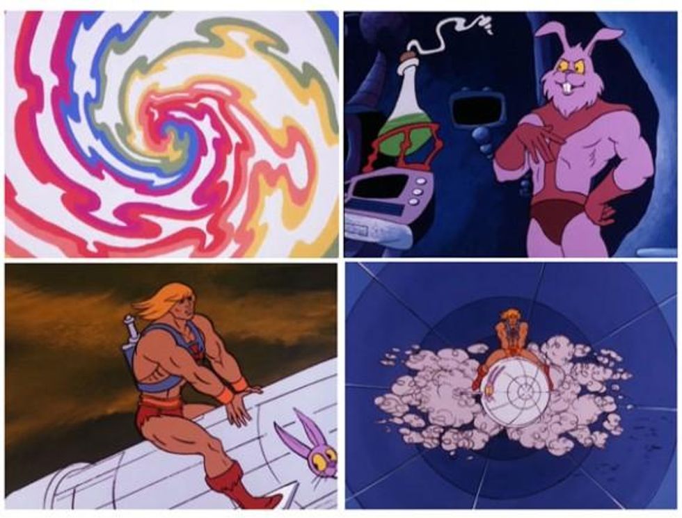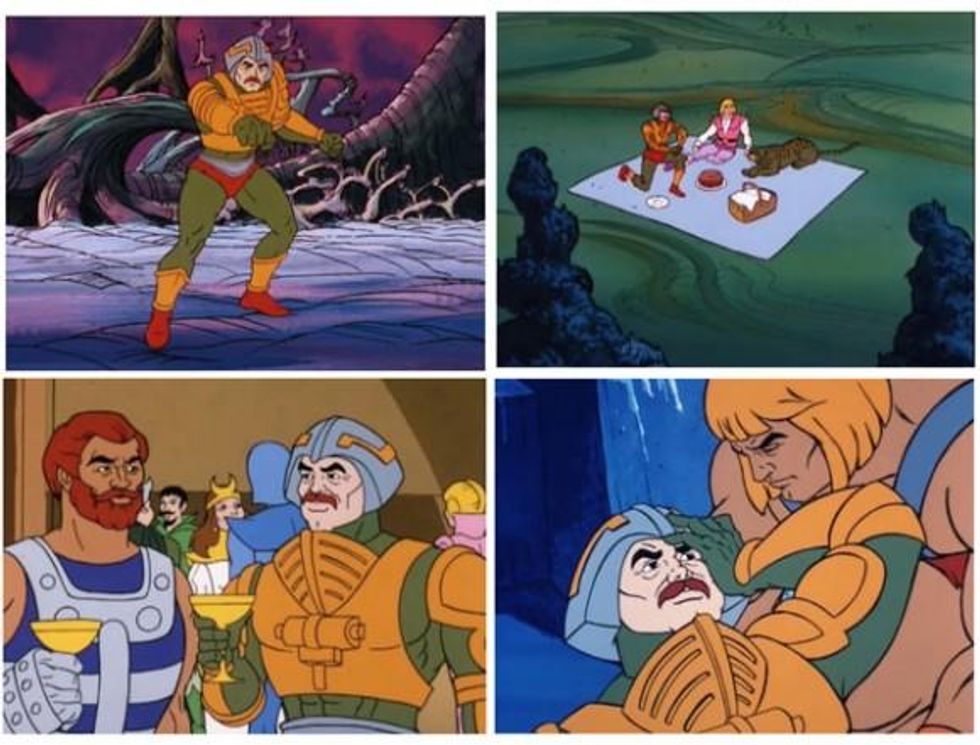 We loved when we saw that over at Cartoon Brew they selected the "He-Man's Five Gayest Adventures"--even if it was just the collage of images from our youth that C. Edwards put together. While we think the rainbow-colored time corridor (and lisping rabbit) of the "Quest for He-Man," may in fact one of the gayest cartoon episodes EVER (and we definitely think He-Man is one of the Gayest Cartoon Characters of All Time), the others selected are pretty homoerotic in their own way.