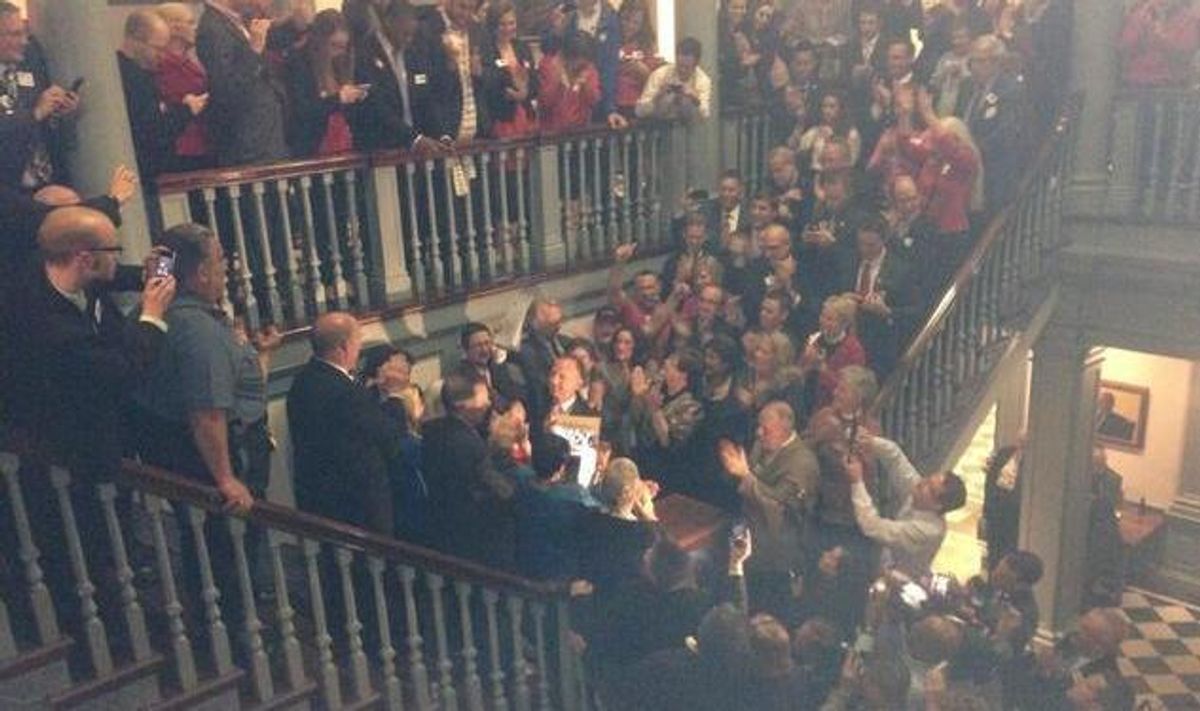 1. Fantastic marriage news out of Delaware: with a 12-9 vote the State Senate gave the green light to a bill legalizing marriage equality. The House had passed that bill and Gov. Jack Markell signed it almost immediately, as seen above in Doug Denison's photo from the moment the state became the 11th in the nation to allow same-sex equality. And as an added piece of good news, Democratic State Sen. Karen Peterson came out during the debate.