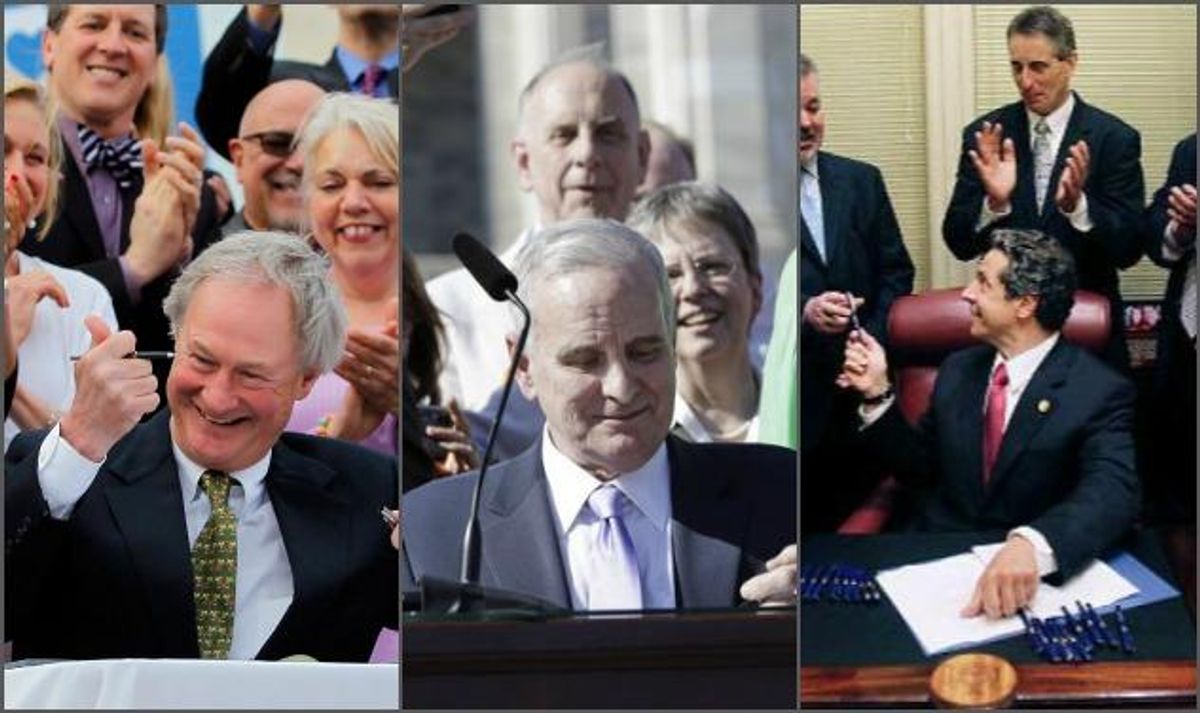 Either way, in honor of Minnesota's big moment, here are all the pictures of governors, and one mayor, signing marriage equality into law. Keep in mind not all of the states where marriage equality has passed required gubernatorial signatures. Mitt Romney certainly didn't celebrate when his state's Supreme Court ruled in 2004 that the state can't segregate marital rights, and Vermont's governor at the time of that state's win, Jim Douglas, vetoed the bill. That veto was in turn overturned by lawmakers, meaning Douglas never had a pro-gay photo-op. Not that he would have smiled, anyway. No signatures were required, or at least trumpeted, in Iowa or Connecticut either.