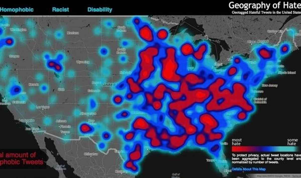 5. Here is a live map of all the homophobic, racist and anti-disabled tweets being sent right now. The Midwest and the South are hot beds.
