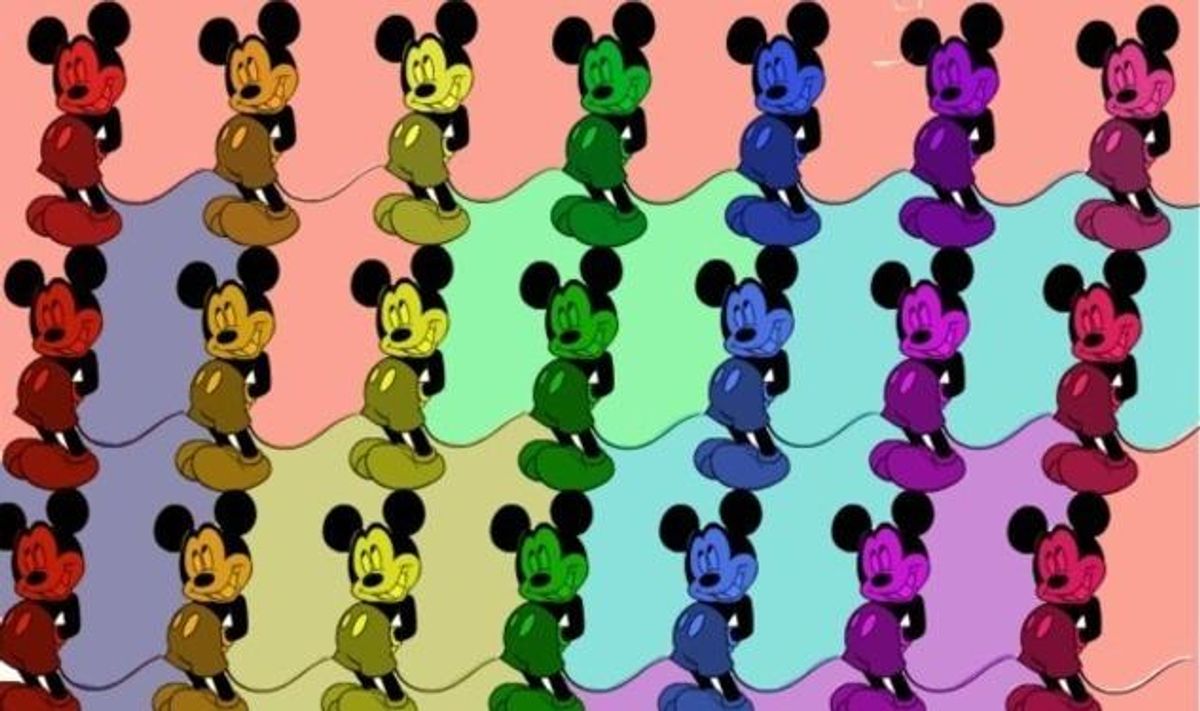 Conservative rainbow crusaders would go ashen at the sight. And they wouldn't be alone. Activists on the far left side of the LGBT political spectrum will read corporate big-wig Mickey's ever-strengthening embrace of the rainbow in the reverse: as the ultimate symbol of the LGBT community's integration into the American mainstream. Consider them lucky, though: unlike the rainbow, irony goes with everything.