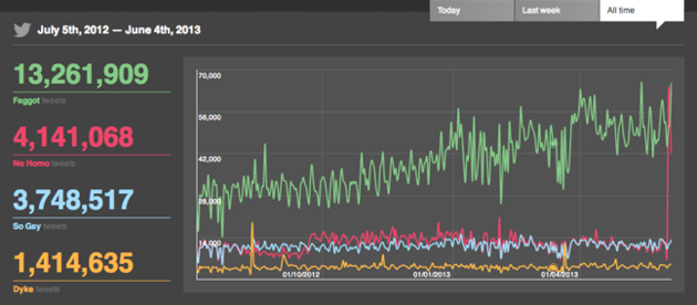 1. The use of the anti-gay epithet "f****t" on Twitter has more than doubled over the past year. Above, usage of "f****t," "no homo," "so gay," and "dyke" since July of 2012. The first two have seen a notable uptick while the other two have held steady.