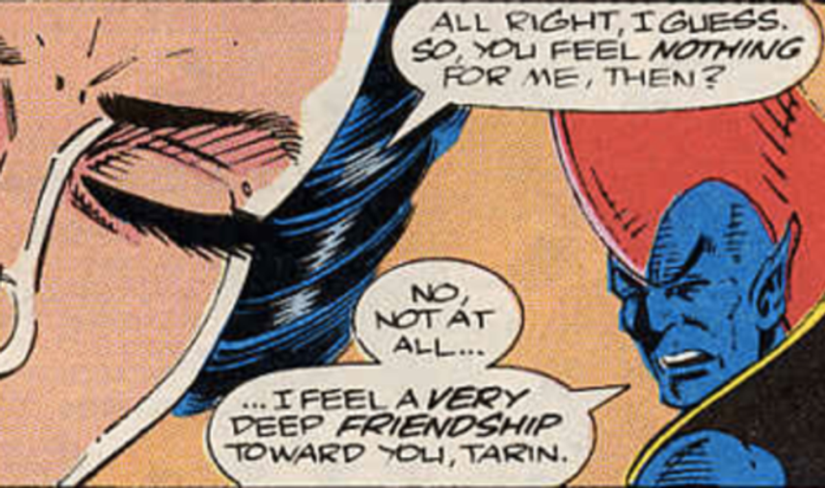 Meanwhile, late-addition female Guardian Nikki, a proudly butch Mercurian, was once brought to a state of ecstasy by a covey of space nuns. And the Guardians's first foes, the alien conquerers The Badoon, were a queer race indeed: the men and women detested one another and lived apart, making no secret of their disinterest in the opposite sex. This is all very well and gay, yes, but nothing compares to the relationship between Astro and another Guardian, the celestially transgender Starhawk.