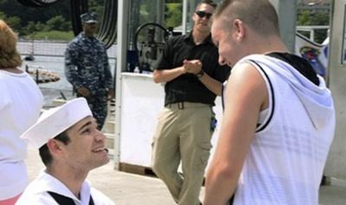 Now we're seeing active duty military hugging, kissing, and leaping for joy when they return. And today we see the cheerful, spontaneous image of a Navy sailor returning from a six-month deployment on his submarine, USS New Mexico, dropping to one knee and proposing to his boyfriend during the homecoming celebration in Connecticut, while approximately 200 well-wishers looked on and snapped photos. Pictured is U.S. Navy, Petty Officer 2nd Class Jerrel Revel (left) proposing to his boyfriend Dylan Kirchner (who seemed to want to get into the nautical theme himself with a black-and-white outfit)