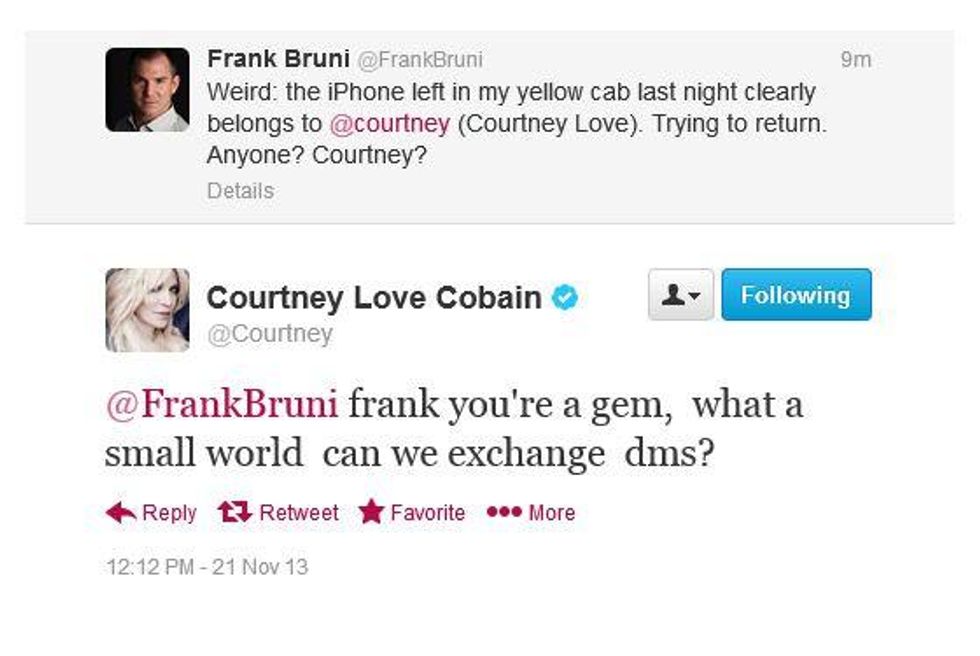 After a series of texts came in the following day, Bruni and his assistant, Isabelle Moschen, put the pieces together...this was Courtney Love's phone. A Twitter communication ensued. Yay, technology!