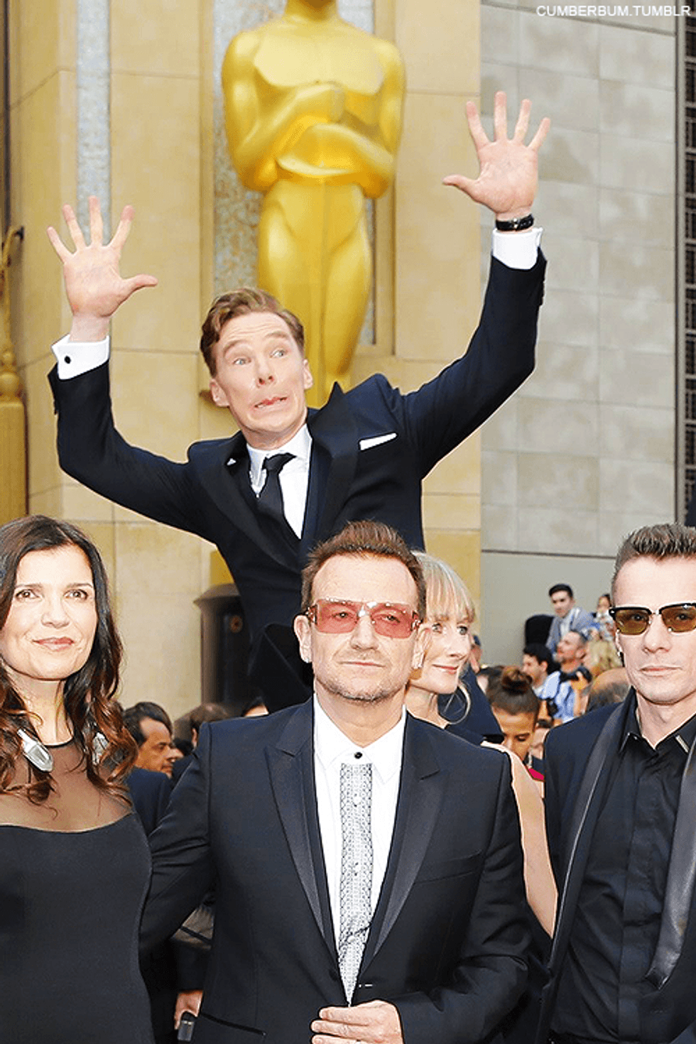 Meanwhile, Benedict Cumberbatch won Photobomb of the Year after leaping into the background of U2's group photo. Benedict cumberbitch-slapped Bono with his amazingness and beautiful face.