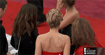 It turns out Simpson is more famous than she lets on. She is the poor girl (wearing black dress and eight pounsd of tulle) that Lawrence grabs onto while tumbling on the red carpet.