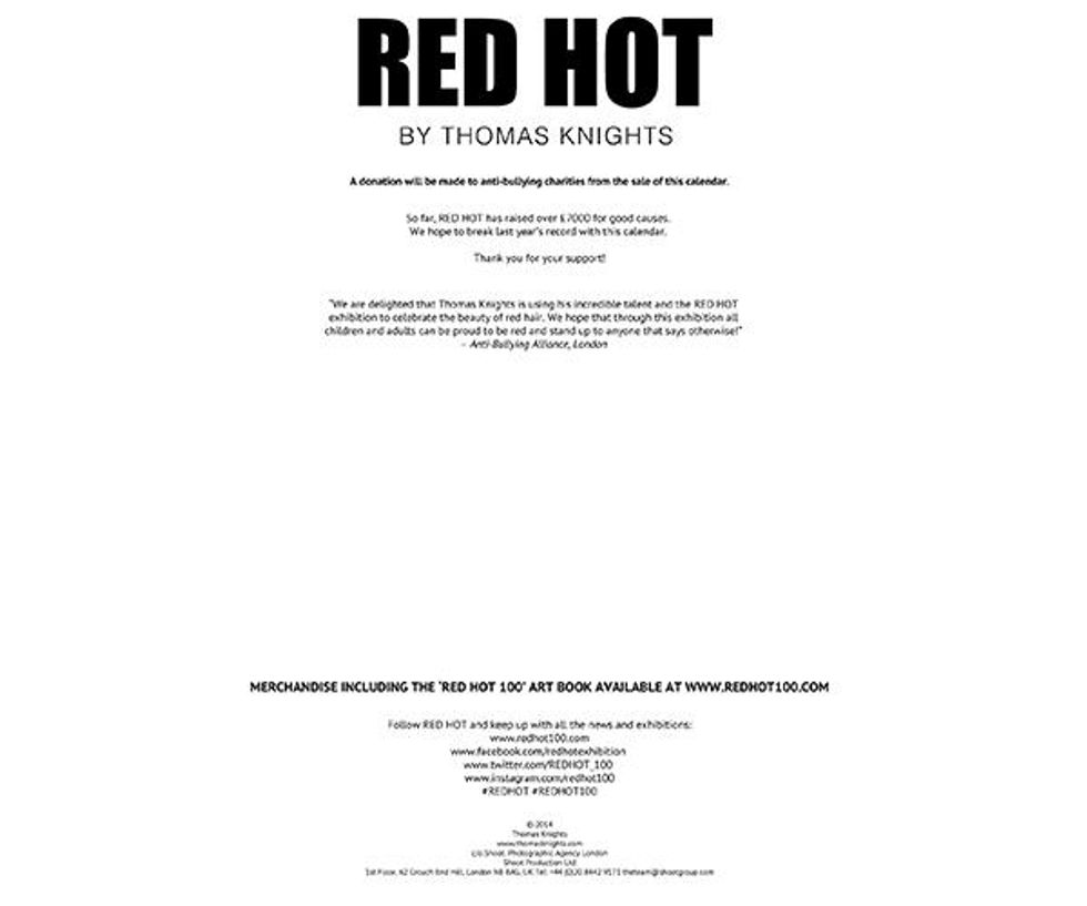 After heating up the Internet with photos of red-haired male beauties, photographer Thomas Knights launches a new book, Red Hot 100, and a 2015 calendar. The men featured in the calendar and book -- including actors, models, and an Olympic gold medallist -- will be on full display at the calendar's official launch party at the BOSI Contemporary Gallery in New York City on Sept. 7. (The exhibition runs from Sept. 3 to Sept. 14.) For those unable to check out his extensive collection in person, enjoy these exclusive images from the 2015 calendar.