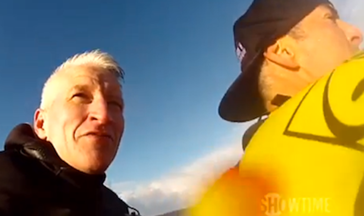 OK, we know that Coop is not afraid to put himself in extreme situations. But now he's going 180 from his fluffy daytime persona and in 60 Minutes Sports on Showtime (which aired March 6) watch what happened when Anderson dared big-wave surfer Garrett McNamara to take a risky ride on a Jet Ski during his reporting assignment in Portugal. Yes, remember when he burned his eyeball? Now we know why.