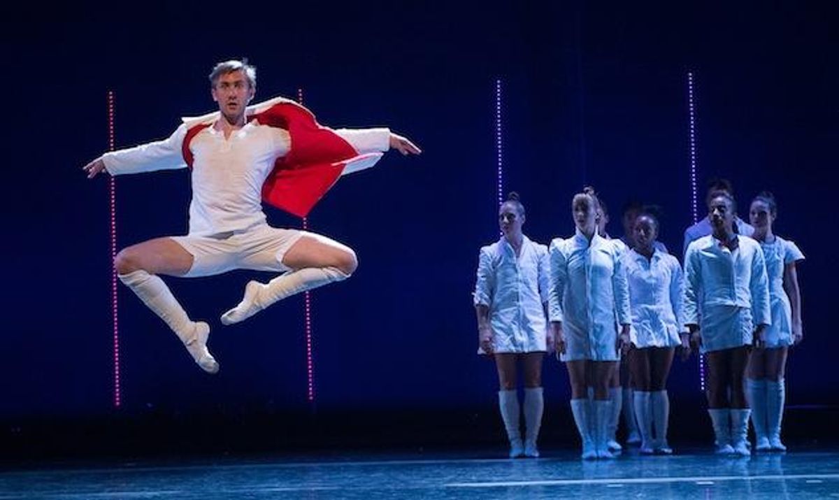 In crisp whites (men in short shorts, women in short skirts, all in reversible tailored jackets that flip to red) the dancers look like a marching band-cum-cheerleading squad, which the choreography's symmetrical compositions, frequent group lifts and presentational "Look at me!" spirit supports. (An occasionally intricate duet hints at McIntyre's capacity for developing more nuanced relationships.)
